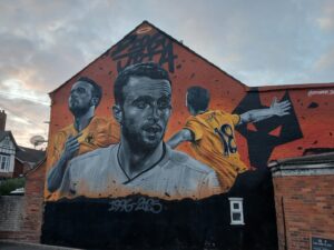 Our match-day outing wouldn’t have felt complete if we hadn’t also gone to see the newly-completed mural at the back of the Leaping Wolf pub near Asda….a watering hole known as The Goal Post in the days when Wolves’ players frequented it more regularly.